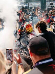 “The first pit stop, I feel like I was five to seven seconds behind those guys coming out of the pits because my bike wouldn’t start. They pushed me probably fifty yards down the pit lane. Then I’m sure everybody saw what happened on pit lane in the last pit stop. The camera guy was filming PJ leaving the pit and I ran him over. I was so angry. I can’t be angry now. Now it’s just funny, but it was one of the worst moments in my career. It felt like something was just helping me out there. Every time something bad happened, I just got carried back to the front. It was just an amazing race. I can’t thank the entire Rahal Ducati Moto team enough. Thank you to Desnuda. Thank you to Brew Watch, Nimbus Healthcare. Thank you to everybody that came in and helped out just for this weekend. It’s an amazing feeling. I can’t describe what it feels like, especially to be wearing this helmet that Troy Lee painted himself to honor Scott Russell, and to have Scott share the helmet on his social media and stuff. It’s a special day. It just doesn’t feel real.”