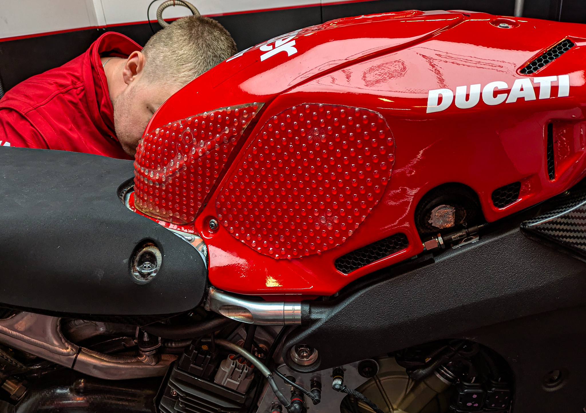 Scott uses the domed Evo Tank Grips on the Ducati Panigale V4.
